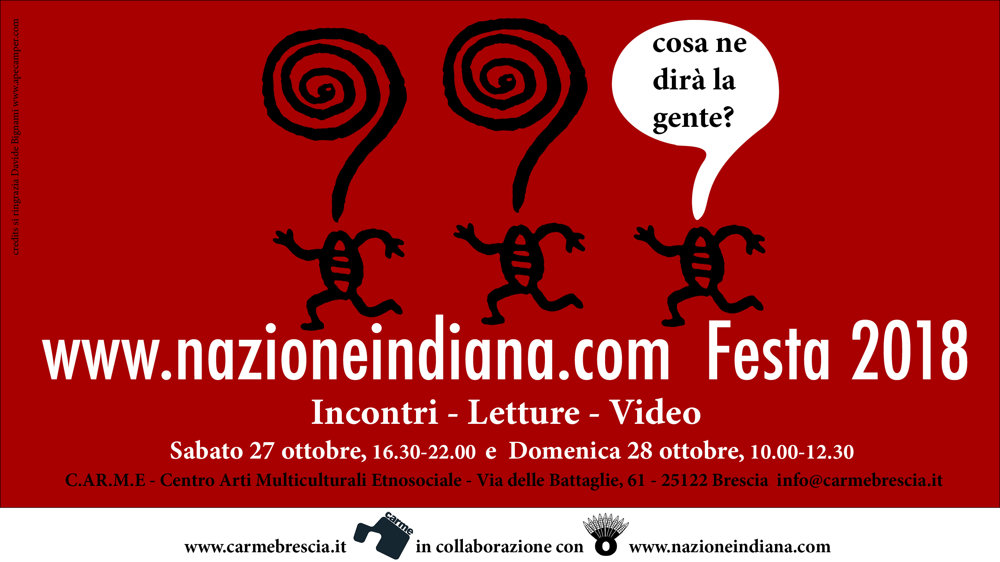 Quest'anno la Festa di NazioneIndiana si terrà a Brescia presso la sede dell'Associazione Culturale C.AR.M.E. con alcuni redattori di Nazione Indiana presenti e pronti a interagire con il pubblico presente: Giacomo Sartori, Jan Reister, Mariasole Ariot, Gianni Biondillo, Gherardo Bortolotti, Antonello Sparzani, Maria Luisa Venuta e la scrittrice Helena Janeczek che ha vinto il Premio Strega 2018 con il romanzo "La ragazza con la Leica" edizioni Guanda. Il titolo è "Che cosa ne dirà la gente?", ed è organizzato in tre momenti: due seminari in cui si ragiona in modo circolare sullo scontro tra modernità e tradizioni, tra radici culturali e cambiamenti, su come questi siano vissuti negli ambiti individuali e familiari nelle famiglie con migranti di seconda generazione (Sabato 27 ottobre dalle 16.30 alle 18.30), su come questi divengano forme urbane di trasformazione di parti della città, come sta accadendo nel progetto "Oltre la strada" in via Milano a Brescia (Domenica 28 ottobre dalle 10 alle 12.30). E la sera di sabato 27 ottobre dalle 21 in poi lasciamo spazio alle espressioni che accomunano NazioneIndiana con l'Associazione Culturale C.AR.M.E. con brevi opere di videoarte che potranno essere visti e discussi anche con gli stessi autori presenti in sala.