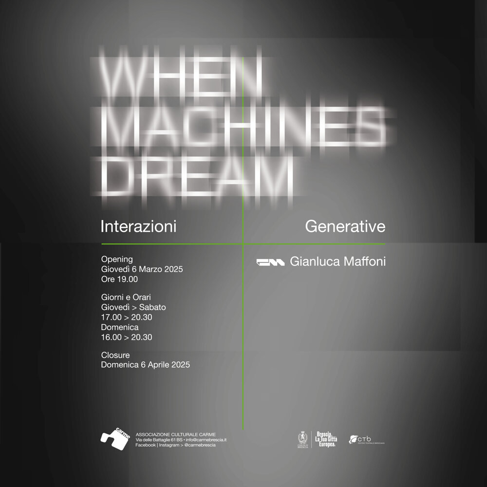 Oltre alla mostra, When Machines Dream offre un’opportunità di approfondimento con due lezioni pratiche tenute da Gianluca Maffoni, dedicate ai temi dell’arte generativa e dell’interazione uomo-macchina.