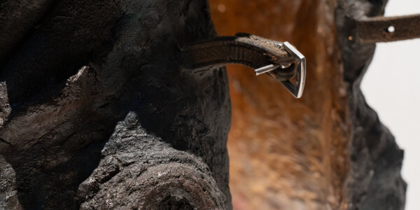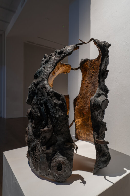 L’opera Habitat, monumento alla sacralità della vita e alla sua ostinata resistenza anche in ambienti ostili, racchiude l’intensità della ricerca di Fontana. La struttura un galestro e ferro si erge come una architettura primordiale: una forma alveolare che si solleva da terra in un moto ascensionale, le cui radici si staccano dal suolo generando un equilibrio tra tensione e leggerezza.