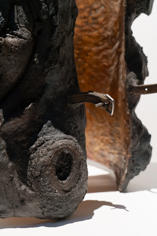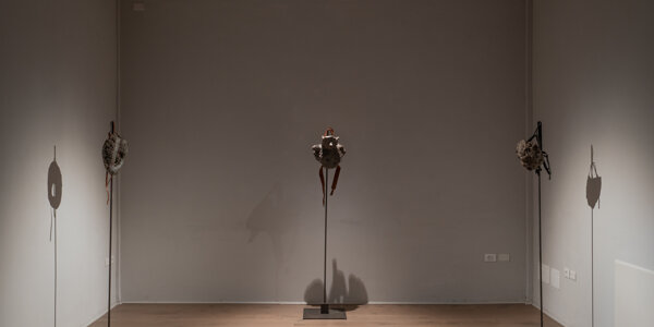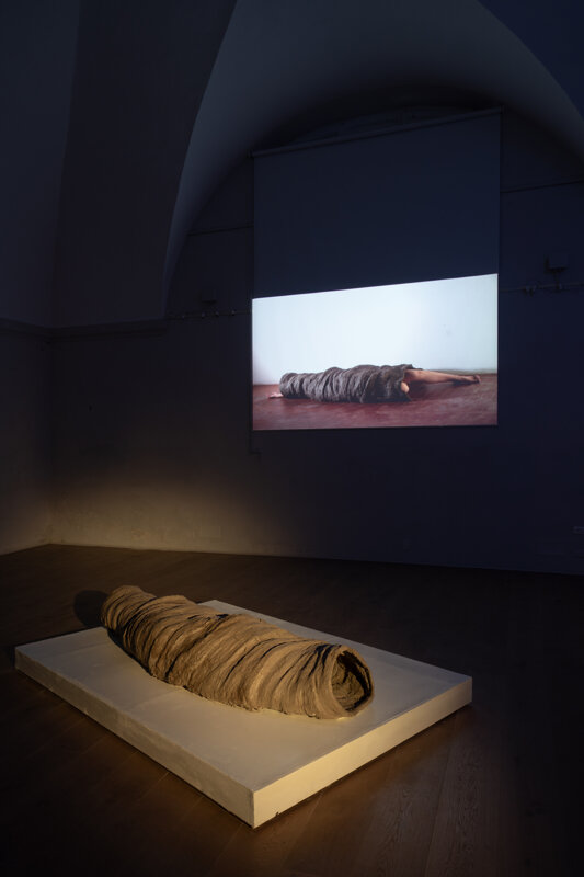 Centro del percorso sono i Dispositivi di protezione individuale, una serie di busti e armature fitomorfi che portano incisi sulla loro superficie i segni di cicatrizzazione degli alberi, metafora delle ferite – visibili e invisibili – che ogni individuo accumula nel corso della propria esistenza. La narrazione dei corpi, liberati dalle retoriche della perfezione, si fa così inno alla fragilità trasformata in forza. Ogni scultura è accompagnata da una bandiera-manifesto che mostra il corpo con dignità, come una mappa universale in cui ritrovare risonanze personali.