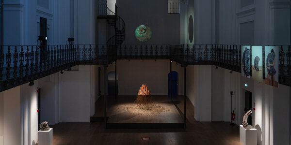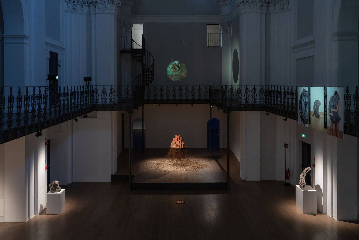 Telluric nest, installata come un rosone al centro della navata, trasporta lo sguardo in una dimensione sospesa e materica, mentre a chiudere il percorso espositivo è Vasaia, scultura che si fa al tempo stesso sarcofago e incubatrice di nuova vita. Un cielo stellato composto da diciannove nodi argentei accompagna simbolicamente il visitatore verso un’elevazione catartica dalla terra al cielo.