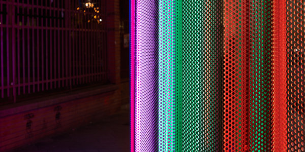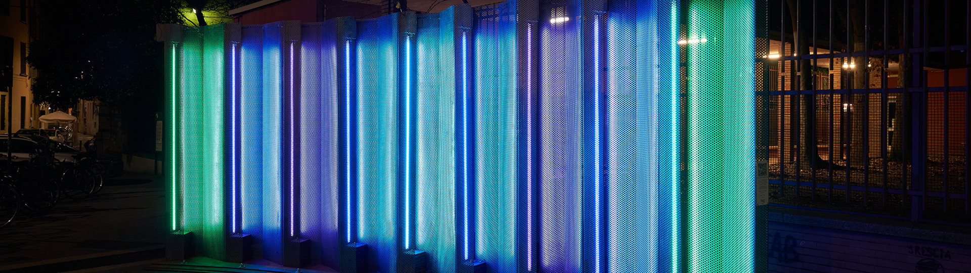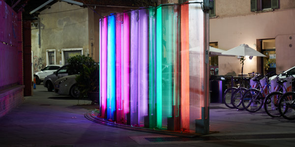 Le Luci degli utenti, memorizzate in una sequenza, andranno a illuminare la struttura stessa dell’opera: difatti, una volta selezionato il nostro colore, lo vedremo coprire lentamente tutta la struttura, andando a sovrapporsi ai colori presenti; campita tutta la superficie, in questo grosso abbraccio di Luce uniforme, il tutto andrà a sfumare nuovamente, lasciando il colore selezionato nel pannello centrale della struttura e spostando i colori precedenti verso l’esterno.