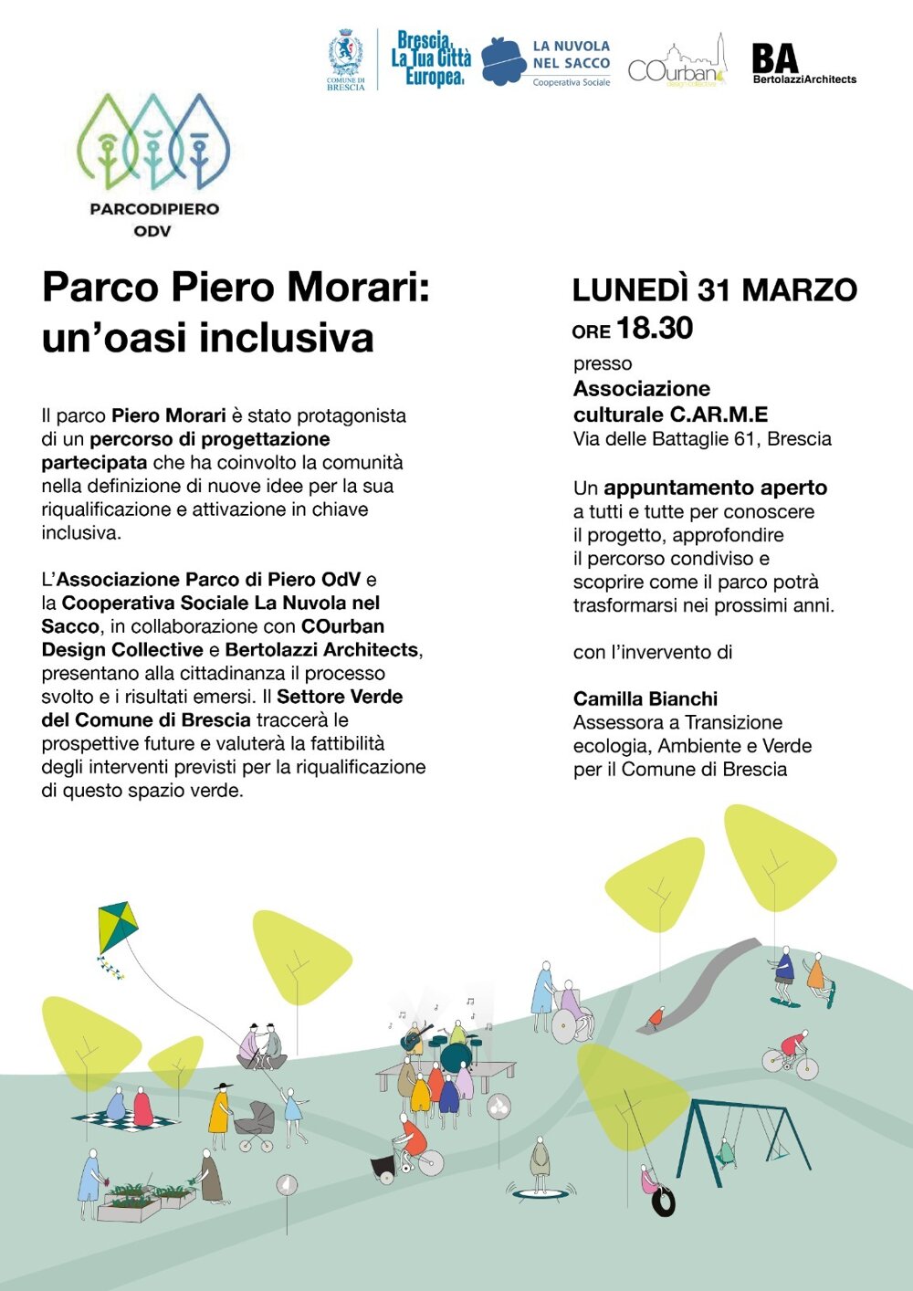 L’Associazione Parco di Piero OdV e la Cooperativa Sociale La Nuvola nel Sacco, in collaborazione con COurban Design Collective e Bertolazzi Architects, presenteranno il processo condiviso che ha portato alla definizione di nuove idee per la riqualificazione e attivazione del parco. Saranno illustrati anche i risultati emersi dal progetto, con la partecipazione del Settore Verde del Comune di Brescia, che traccerà le prospettive future e valuterà la fattibilità degli interventi previsti.