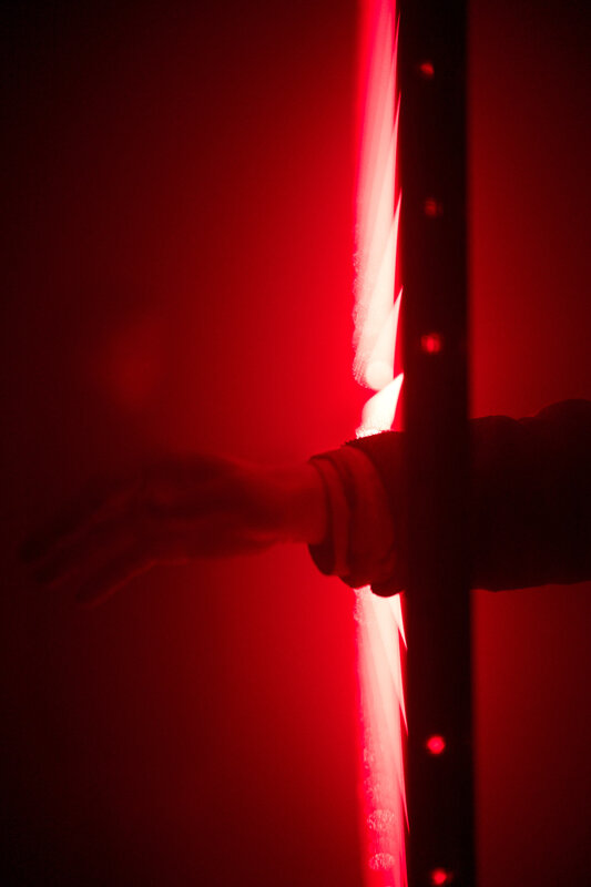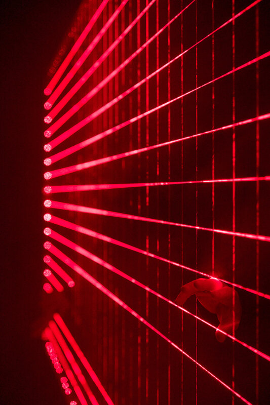 Le opere protagoniste dell’esposizione, Around e Contatto, creano un’interazione tra sensori e algoritmi generativi, dando vita a un’esperienza immersiva in cui ogni movimento diventa un atto creativo.