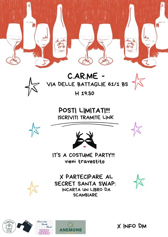 CARME ospita un nuovo appuntamento speciale, nato in collaborazione con i Book Club Granyta e I Leggioni: una cena in maschera letteraria, aperta a tutti, per vivere insieme una serata leggera, accogliente e piena di cultura condivisa.